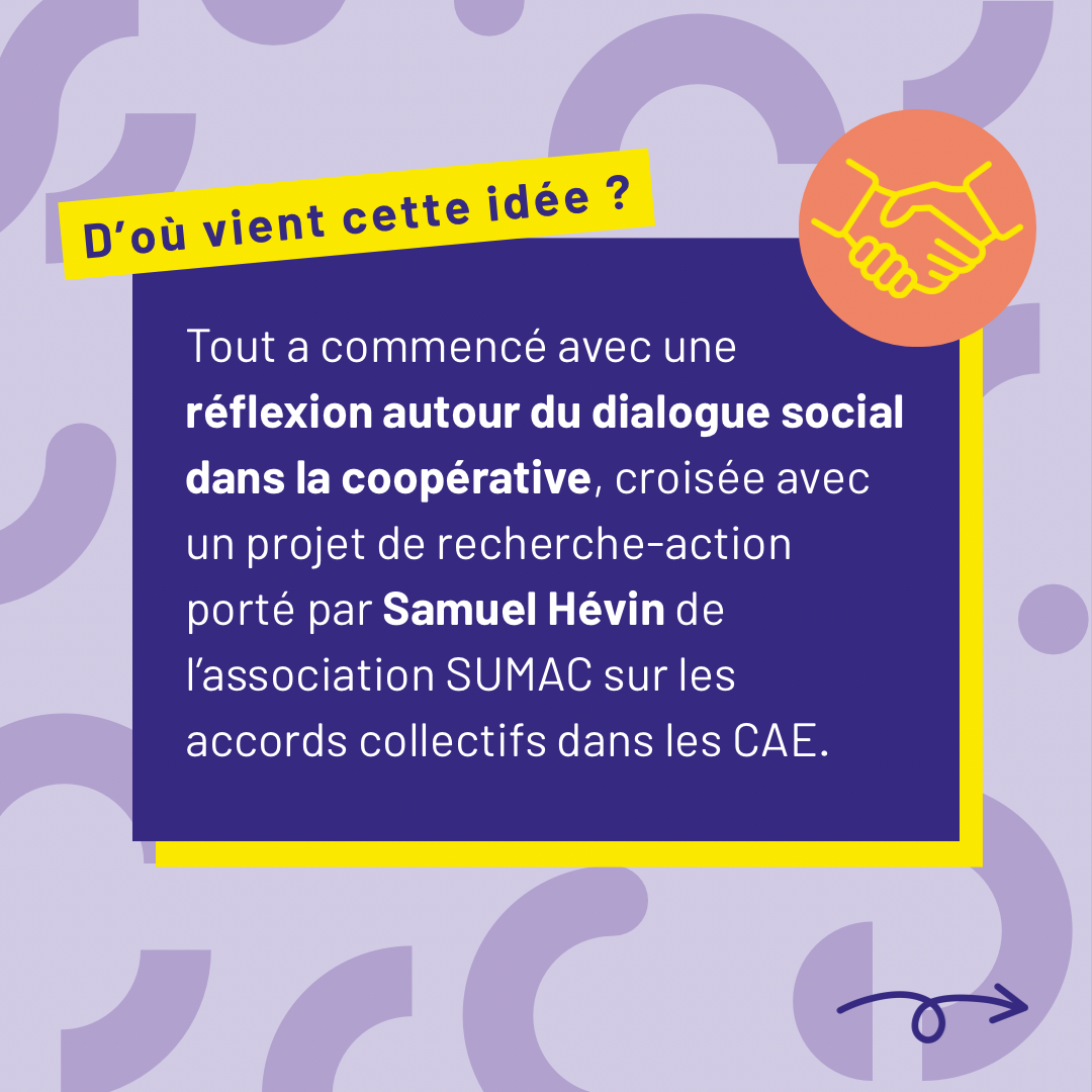 Il y a deux ans, le conseil coopératif et la commission RH de Co-actions se sont penchés sur la question du CSE. À ce moment-là, nous avons été contactés par Samuel Hévin pour intégrer le projet NéGo, financé par le Fonds pour l’Amélioration des Conditions de Travail (FACT). Ce projet, qui regroupe 8 CAE, avait pour objectif d’expérimenter de nouvelles formes de dialogue social en coopérative.